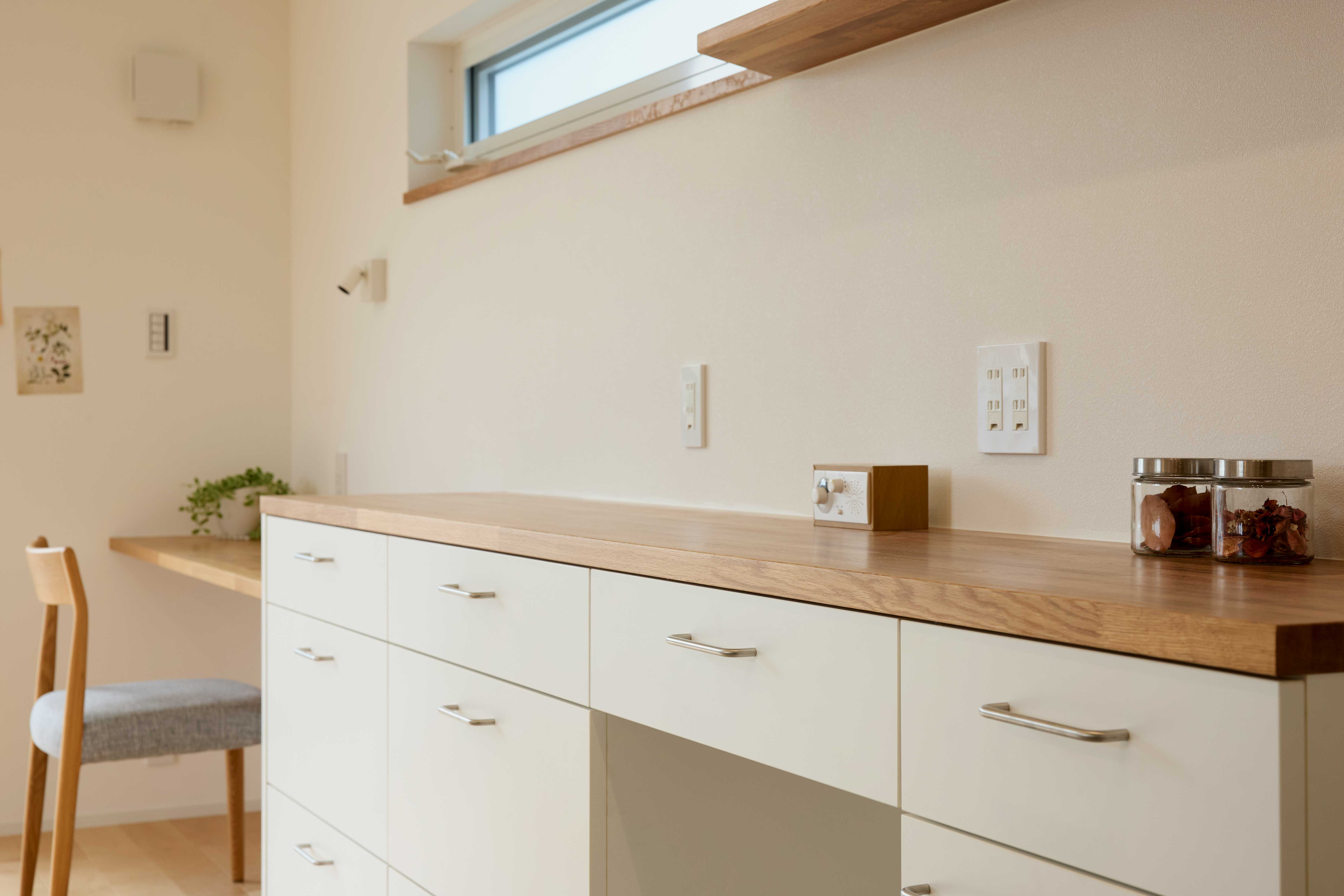 そこで生まれたのが、階段下のおこもり空間=ヌックです。このヌックと、床のカバ材フローリングが醸し出す優しい雰囲気は、包み込まれるような居心地の良さを感じさせてくれます。18帖と決して広くはないLDKが、温かい巣のようなリラックス空間になりました。