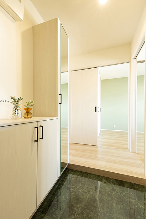 | こんな施工を行いました | かつてお施主様のご両親が住まわれていたマンションの一室。 内装は老朽化が進み、住宅設備も入れ替えが必要だったため、思い切ってフルリノベーションに! LDKを広く確保し、収納もたっぷり備えました。 パントリーを経由する回遊動線で、家事がはかどる間取りがうれしいですね。 お二人が大好きなグリーンをアクセントカラーに、 楽しい新生活のための住まいが完成しました。 |